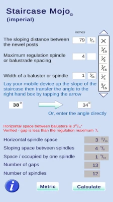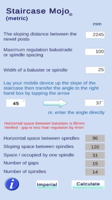 Cansado de medições complicadas e níveis de bolha imprecisos ao projetar escadas? Esta ferramenta inovadora transforma seu dispositivo móvel numa solução poderosa para determinar automaticamente o ângulo de inclinação. Basta posicionar o telefone ao longo da rampa da escada e, com um simples toque no botão de seta, o valor do ângulo é transferido instantaneamente para a caixa de entrada. Diga adeus à frustração das estimativas e obtenha a precisão que seu projeto exige. Para aqueles que já possuem o ângulo, a flexibilidade é garantida com a opção de inseri-lo manualmente, adaptando-se perfeitamente às suas necessidades.