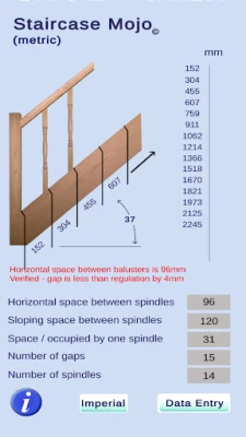 Para um acabamento verdadeiramente profissional, o aplicativo permite refinar o espaçamento máximo regulamentar, que por padrão é de 98mm. Essa funcionalidade é especialmente útil para adaptar-se a balaústres torneados com perfis cónicos, onde o ajuste fino é crucial. É importante notar que o algoritmo subjacente garante um ajuste ideal com uma precisão milimétrica. Em cenários específicos, pode ser vantajoso ajustar ligeiramente a largura máxima de regulamentação e recalcular. Essa otimização pode, por exemplo, reduzir o número de fusos necessários em uma unidade, sempre em consideração das normas legais, como o máximo de 100mm no Reino Unido ou 4 polegadas nos EUA, assegurando que seu projeto esteja sempre em conformidade.